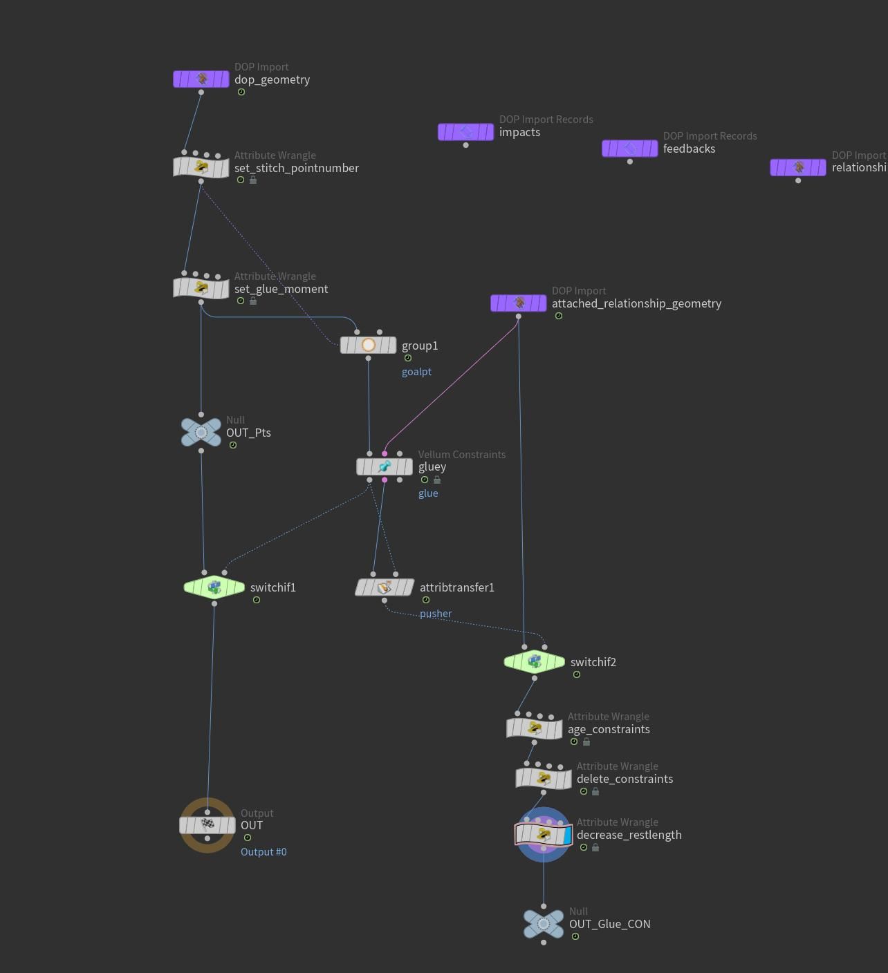 The chain on the right is working on the ConstraintGeometry. It’s importing the existing constraints, checking if it’s time for a new constraint, and then exporting that to the ConstraintGeometry SOP solver.